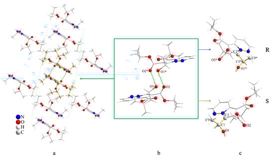 Compounds 1–5 crystalize as racemates either in monoclinic (1, 3A, 5) or triclinic (2, 3B, 4) crystal systems, in centrosymmetric space groups (Table 1 and Figure 1, Figure 2, Figure 3, Figure 4, Figure 5, Figure 6 and Figure 7). For each compound, the two enantiomers, R and S, are associated in the crystal structure via hydrogen bonds in supra-molecular dimers. For each case, the alcohol group directly linked to the asymmetric carbon is involved in a hydrogen bond with an oxygen atom belonging to an ester group from a neighboring molecule, excepting compound 5. In this particular case, the nitrile group is involved in the hydrogen bond [41].