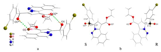 (a) Each molecule of compound 2 forms with an adjacent one a supramolecular dimer via two hydrogen bonds. (O1-)H···O2* = 2.040, O1···O2* = 2.859 Å, O1-H-O2* = 176.9°. (b) View of the two enantiomers, R and S, placed side by side. The asymmetric carbon atom is depicted in black. Symmetry operation: * = 1 − x, 1 − y, 1 − z.