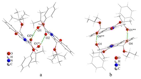 (a) View along a-axis of the supramolecular dimer formed by two molecules of 3A. (O1-)H···O2* = 2.000, O1···O2* = 2.819 Å, O1-H-O2* = 167.6°. One of the isopropyl groups is disordered on two crystallographic positions with occupancies of 0.7 and 0.3, respectively. (b) View along a-axis of the supramolecular dimer formed by two molecules of 3B. (O1-)H···O4** = 1.944, O1···O4** = 2.762 Å, O1-H-O4** = 175.6°. Symmetry operations: * = 1 − x, 1 − y, 1 − z, ** = 1 − x, 2 − y, 1 − z.