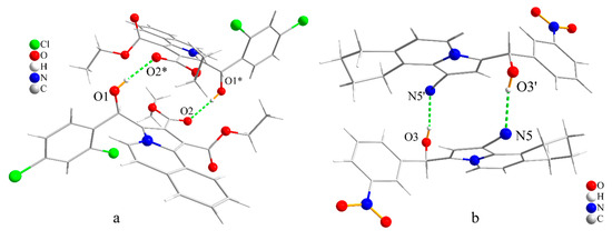 Polymorph 3B presents with about 10% more H···H interactions than 3A which has a more compact structure and a higher percentage of O···H interactions. The O···H contacts are the most relevant for compounds 1–5, which show similar figures. In contrast to compounds 1–5, the analogue structure HUXYAD (Figure 9) does not form dimers; however, the OH and COOEt groups are implied in the H-bond. Most likely, the steric hindrance of the large aromatic groups attached to the pyrrole ring does not allow the molecules a planar configuration approach, preventing the formation of the dimers.