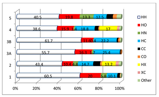 Percentage interactions extracted from the fingerprint plots of compounds 1–5.