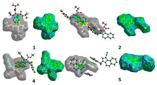 The Hirshfeld surfaces [30] of compounds 1–5 were generated by CrystalExplorer [31]. Figure 3 visually depicts the main interactions in the supramolecular structures. The red spots in dnorm mode present the locations of the non-covalent contacts with distances under the van der Waals radii. These will be discussed in the next chapter.