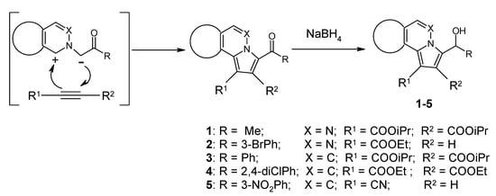 The secondary alcohols of pyrrolo-condensed azines were reported by Miki et al. [24] as building blocks of bis-heterocyclic compounds. Thus, following a similar approach, we obtained novel pyrrolo-condensed azines and diazines 1–5 (Table 1 for molecular structures) bearing OH groups at C-3 of the pyrrole ring, with the aim of obtaining functionalized bis-heterocycles (unpublished material). These pyrrolo-azines were obtained by the cycloaddition of the N-ylides generated in situ and different dipolarophiles in a two-step [12,13,14] or one-pot multicomponent [12,13,14,15,16]. After the hydrogenation of the ketone groups, the alcohols 1–5 were obtained in good yields (Scheme 1).