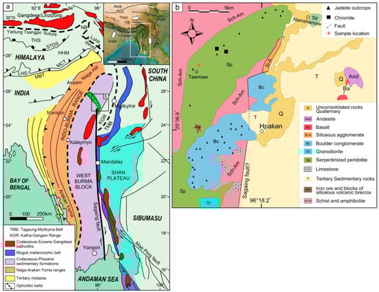Geological sketch maps of (a) Myanmar (modified from []) and (b) the Myanmar jadeite belt (modified from []).