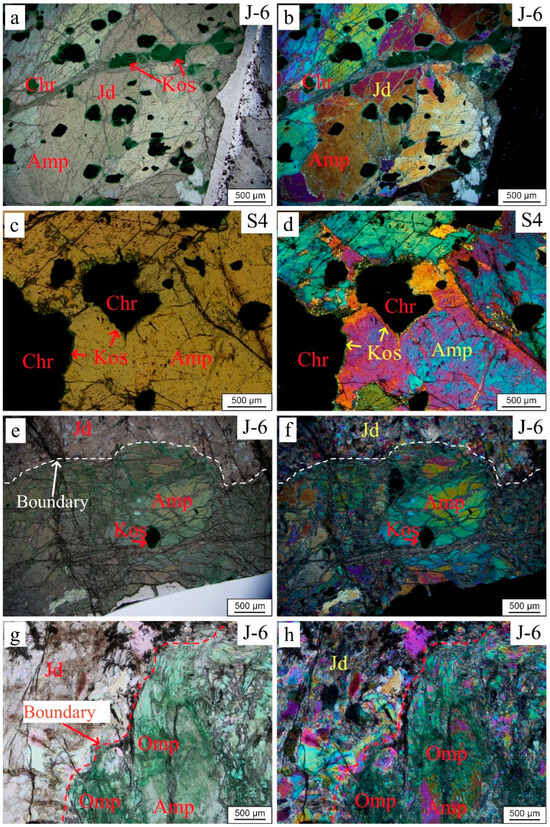 Photomicrographs showing the relationship between amphibole and related minerals. (a,b): Late jadeite veins filled along the amphibole fractures. (c,d): Green kosmochlor occurs as spheroidal or ellipsoidal aggregates with residual chromite in the core, which have been enveloped by amphiboles. (e–h): Highly deformed amphibole fragments at the jadeite boundary (left column: PPL and right column: XPL). Chr: chromite, Jd: jadeite, Omp: omphacite, Kos: kosmochlor, and Amp: amphibole.