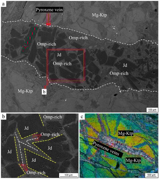 (a) BSE image of the pyroxene vein that cut the magnesio-katophorite. Dark color: jadeite (Jd); grey: omphacite-rich jadeite (Omp-rich); and light grey: magnesio-katophorite (Mg-Ktp). (b) Jadeite in the vein is euhedral prismatic, often with an outer omphacite-rich rim. (c) Pyroxene veins occur as fracture-/cleavage-filling veins in magnesio-katophorite.