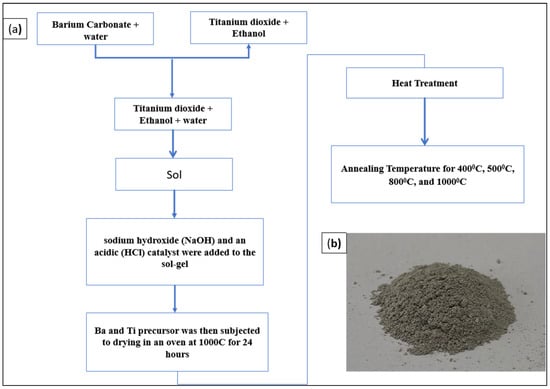 We used the Sol-gel technique for the synthesis of the nanocrystalline BaTiO3 powder. As the source of Ti ions, Titanium tetra-isopropyl was utilized. To produce barium titanate, BaCO3 was used as a source. We dispersed barium carbonate in water in a ratio of 1:1 and stirred with an electric stirrer for 2 h at the temperature of 65 °C. Using the same ratio, we also dissolved Titanium Dioxide in ethanol, and later water was added to the solution in a ratio of 1:30 after 1 h. The solution was mixed and stirred to form a sol that consists of barium and titanium in a ratio of 1:1. To examine the impact of pH on the calcination temperature of pure BaTiO3, a basic sodium hydroxide (NaOH) and a hydrogen chloride catalyst were added to the sol-gel. After a certain duration, a transparent gel was produced. The Ba and Ti precursor was then subjected to drying in an oven at 100 °C for 24 h, followed by grinding and heat treatment to obtain crystalline BaTiO3 powder. The samples were annealed at temperatures of 400 °C, 500 °C, 800 °C, and 1000 °C, with a heating rate of 10 °C/min, to investigate the impact of annealing temperature on the prepared sample. Figure 1 illustrates the flow chart procedure for the synthesis approach and BaTiO3 nano-powder.