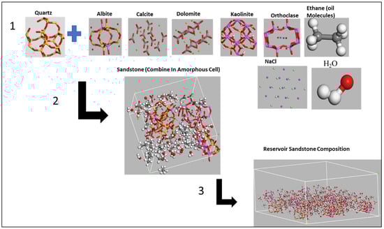 The simulation procedure for reservoir sandstone using molecular dynamics requires careful selection of a suitable potential energy function, generation of an initial configuration, equilibration, production run, and analysis of the results. The success of the simulation depends on the accuracy and realism of the potential energy function, as well as the availability of sufficient computational resources to simulate an appropriate amount of time. The reservoir composition was imported from the library of the material studio which consisted of kaolinite (5%), albite (5%), SiO2-quartz (75%), calcite (5%), dolomite (5%), orthoclase (5%), ethane, which was used to represent oil, NaCl for the salt, and H2O for the reservoir composition (Figure 2, step 1). Ethane (C2H6) is a component of natural gas and light hydrocarbons commonly found in petroleum reservoirs. Using it in simulations helps model the behavior of light hydrocarbons in the oil phase. It serves as a proxy for lighter oil fractions, which are key to understanding interactions in gas-injection EOR methods. Ethane has well-studied phase behavior, including its critical temperature (305.32 K) and critical pressure (4.87 MPa), which are relevant for conditions found in reservoirs. Its ability to exist in liquid and vapor phases at reservoir conditions makes it suitable for studying multiphase flow and miscibility during EOR processes.