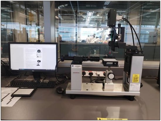The existing IFT between oil/brine/nanofluids and wettability between three phases of fluids/oil/sandstone was determined using a Goniometer (Ramé-hart Model 260) at 60 °C. The pendant drop technique was the method used for IFT measurement, while drop shape Analyzer software, SVT20 for the contact angle, was used to determine wettability alteration (Figure 4). The EM energy was propagated from a radio frequency signal generator (33500B, Agilent, Santa Clara, CA, USA) through a solenoid coil that was installed surrounding the experimental chamber. The experimental chamber was connected to the temperature controller which supplies the required heat at a certain temperature to the chamber. The experimental chamber contained a small container of 5 mL filled with nanofluids, at the middle of the container, a sandstone was fixed on supporting metal in which the crude oil was injected in the nanofluids using an inverted syringe under the surface and mounted on the sandstone. As a result, the image of the oil droplet was exhibited on the computer’s screen, and the lamp was utilized to shine light through the sample in the container for good visibility of the image. The interfacial tension (γ) between droplet images and nanofluids was determined by using the following equation: