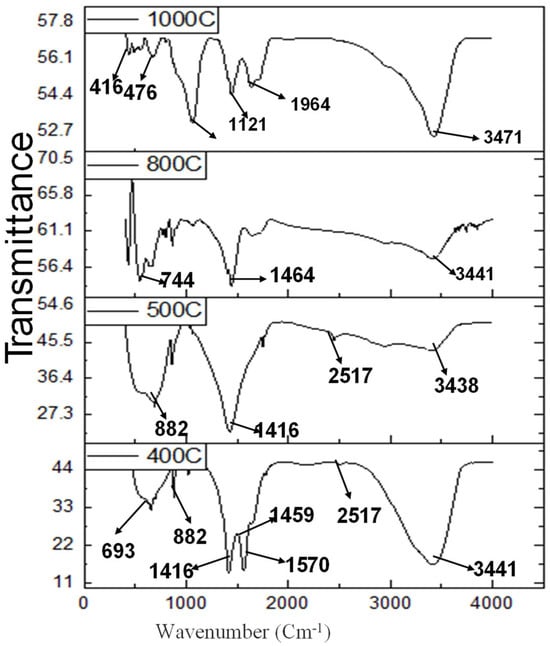 The characterization of the barium titanate analysis using the FTIR with Vacuum and Flow Module, Model: Perkin Elmer was conducted. The K-Alpha wavelengths of 1. 540598 and K-Alpha 2 of the wavelength of 1.544426 were used, and the scan range was 4.9997 to 130 at room temperature for wavelengths of 400–4500 cm−1. The FTIR spectrum of a sample collected in transmittance mode is presented in Figure 5. The stretching in Ti–O (normal and bending mode), Ti, OH, COO, OH, and Ba OH bonds exhibited vibrational peaks at 476 cm−1, 693 cm−1, 882 cm−1, 1416 cm−1, 1570 cm−1, 2517 cm−1, and 3441 cm−1 of BaTiO3 [44,45]. The infrared absorption area was found to be located between 500 and 800 cm−1. Ti–O bending vibrations along the polar axis caused high peaks at 476 cm−1, whereas stretching vibrations caused weak peaks at 693 cm−1. The bending vibrations in the COO- group induced by the acetic acid ligand were responsible for the vibrational peaks at 882 cm−1and 1416 cm−1. Vibrational peaks at 1570 cm−1 and 2517 cm−1 were caused by OH stretching vibrations, and the concentration of H2O and propanol were responsible for OH-deformation vibrations [46].