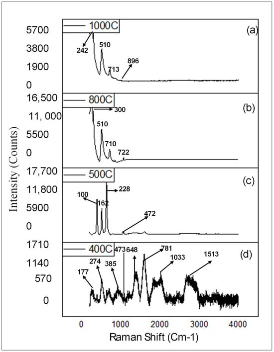 The Raman spectral analysis of BaTiO3 (a) BaTiO3 at 400 °C, (b) BaTiO3 at 500 °C, (c) BaTiO3 at 800 °C, and (d) BaTiO3 at 1000 °C.