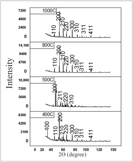 The planes (100), (110), (111), (200), (210), (211), and (220) were assigned to the peaks at 22.5°, 31.8°, 39°, 45°, 51.5°, 56.7°, and 66.2°, respectively. The tetragonal nature of the BaTiO3 nanoparticle calcined at 1000 °C is indicated by the peak split at 2 = 45.1° for (002) and 2 = 45.7° for (200). In contrast, BaTiO3 calcined at 800 °C, which is in the cubic phase, does not exhibit such a peak split at 2 = 45° (Figure 6), which is in agreement with previous findings [27,52]. The Scherrer equation (in Equation (2)) can be used to calculate the average particle size from XRD.