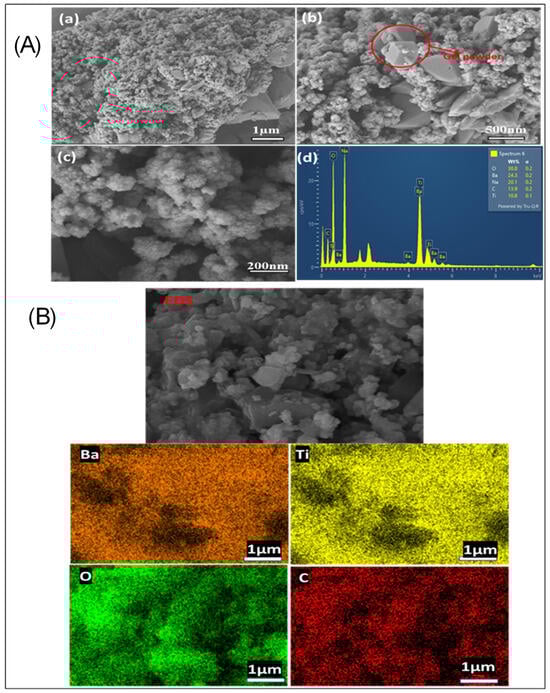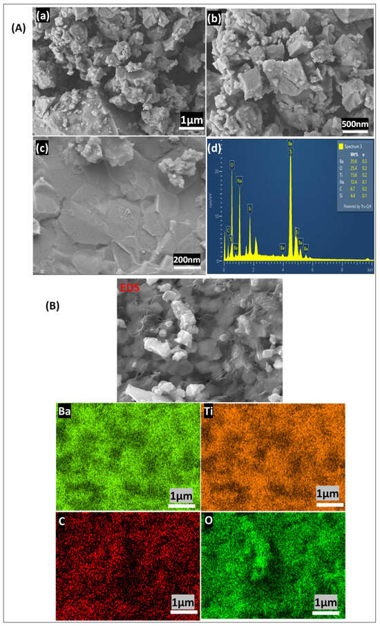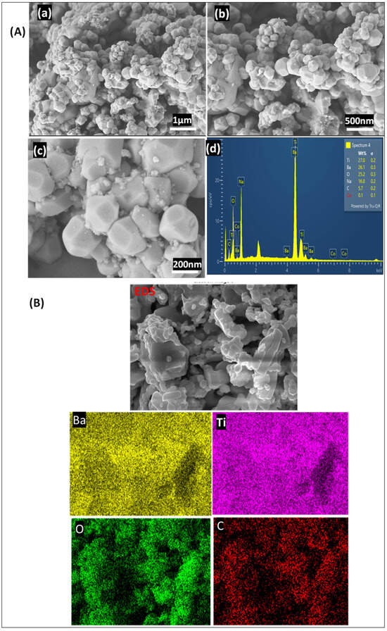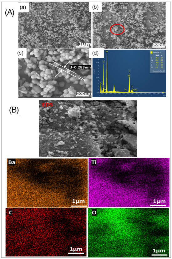 FE-SEM image of BaTiO3 at 1000 °C (A) (a–d) show the morphological structure of BaTiO3 at 1 µm, 500 nm, 200 nm, and the EDX spectral. (B) Shows the EDS image for the Mapping at: 1 µm.