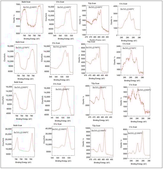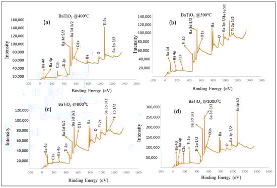 The XPS analysis of the BaTiO3 at different temperatures (a) BaTiO3 at 400 °C, (b) BaTiO3 at 500 °C, (c) BaTiO3 at 800 °C, and (d) BaTiO3 at 1000 °C.