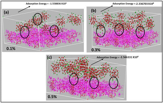 The adsorption configuration of BaTiO3 on reservoir sandstone at different concentrations of (a) adsorption at 0.1wt%, (b) adsorption at 0.3wt%, and (c) adsorption at 0.5wt%.