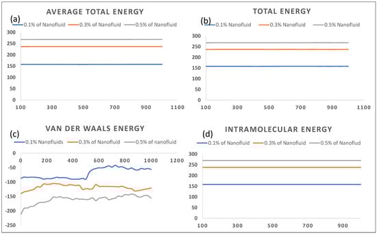 The energy interactions of BaTiO3 nanofluid at different weight percent (a) Average total energy of BaTiO3 at 0.1, 0.3, and 0.5wt% (b) Total energy of BaTiO3 at 0.1, 0.3, and 0.5wt%, (c) Van der Waals energy of BaTiO3 at 0.1, 0.3 and 0.5wt%, and (d) intramolecular energy of BaTiO3 at 0.1, 0.3 and 0.5wt%.