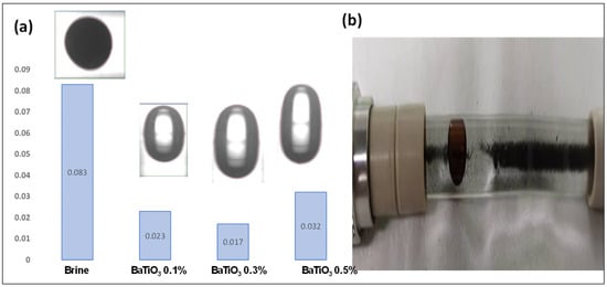 The adsorption of nanoparticle interaction at the liquid–liquid interface between oil and nanofluids to determine the stability between the two fluids and the force of attraction that occur between them were also investigated to detect the effect of BaTiO3 nanofluids at different concentrations of 0.1%, 0.3%, and 0.5% on IFT reduction, respectively. The experiment was conducted at 80 °C using a spinning drop Video Tensiometer (SVT). Figure 18 presents the result of the brine baseline, BaTiO3 nanofluid at the concentration of 0.1, 0.3, and 0.5%, respectively, to determine which concentration is best for the nanoparticle dispersion into the reservoir to prevent nanoparticles deposition on reservoir sandstone that might lead to blockage of the pore throat. The results were recorded according to the Young Laplace principle (LY, mN/m) with a rotation speed of 3000 (1/min), phase density of 0.999g/cm−3,, and refractive index of 1.3246 with a time count of about 3675s. After the oil droplet was stabilized, the average value of the IFT at each concentration of BaTiO3 nanofluids was recorded. The interface baseline IFT between brine and oil interaction was 8.3 ± 0.8 mN/m, which serves as the baseline of comparison with the nanofluid injection. At 0.1% concentration, the IFT value was 0.023 mN/m, at 0.3% concentration, the IFT was 0.017 mN/m, and at 0.5% concentration, the IFT value was 0.032 mN/m, respectively (Figure 18). It has been revealed from the result that at 0.3% the highest IFT reduction efficiency of 80% was achieved. For brine, the reduction efficiency was 72%, and for 0.5%, the reduction efficiency was 61%, which shows that the reduction range was 8–10 mN/m.