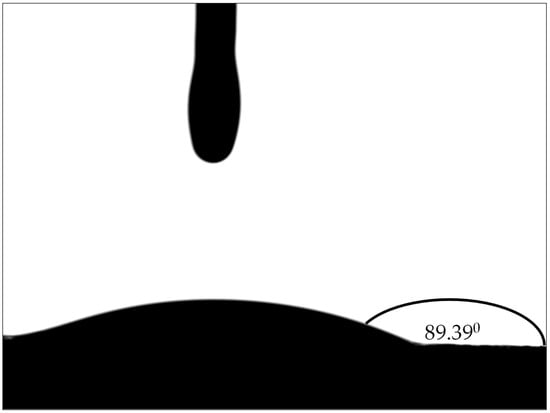 Wettability plays a crucial role in determining the efficiency of fluid displacement in porous media and thus has a substantial influence on enhancing oil recovery. The altering of the rock wettability from oil-wet to water-wet is one of the most important mechanisms used to attain improved oil recovery. The adhesion of fluids on a solid surface or spread on the solid surface in the occurrence of other immiscible liquids is known as wettability. The measurement of wettability alteration in a three-phase system is known as the contact angle, which can be explained as the equilibrium of forces between the spreading coefficient of water on a solid surface in contact with both oil and water [53]. Several methods have been used in laboratory experiments to determine the contact angle between the liquid and solid [54]. The application of nanoparticles is one of the prominent methods in enhancing oil recovery by altering the wettability of the rock by exchanging the carboxylic particles on the rock surface. Nanoparticles create a wedge film that generates disjoining pressure and displaces the oil droplets out of the rock surface. This mechanism is supported by many researchers who have observed that nanofluids can alter the wettability of the rock surface. The adsorption of nanoparticles on the surface of the rocks will create nanotextured surfaces that will lead to changes in the morphology of the rocks and make them semi-homogeneous. This causes a layer of nanofluids to develop on the surface of the rocks, which separates and releases the oil droplets from the rocks, increasing oil output. Nevertheless, several variables, including concentration, size, salinity, temperature, and rock properties, affect how effective the nanofluid layer is. Additionally, nanoparticles can alter the interaction between the rock surface and monovalent and divalent ions (Na+, K+, Ca2+, and Mg2+), resulting in a shift towards stronger water wet. Silicon oxide (SiO2) and titanium oxide (TiO2) nanoparticles are commonly used in this mechanism, with researchers generally agreeing that disjoining pressure is a crucial factor in wettability alteration studies for enhanced oil recovery. This present work used BaTiO3 nanofluid at different concentrations of 0.1, 0.3, and respectively, using drop shape Analyzer software. Figure 19 shows the baseline measurements in the absence of BaTiO3 nanofluid