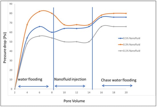 The performance of differential pressure in the porous medium with BaTiO3 nanofluids injection at different concentrations.