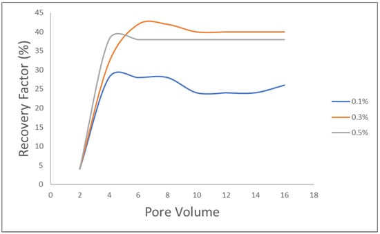 The results depicted in Figure 19 illustrate the impact of varying BaTiO3 nanofluid concentrations (0.1 wt. %, 0.3 wt. %, and 0.5 wt%) on residual oil in place (ROIP). The findings reveal a gradual improvement in oil recovery as the nanofluid concentration increases. Specifically, at a 0.1% nanofluid concentration (as shown in Figure 22), the oil recovery stands at 27%. Subsequently, when the nanofluid concentration is raised to 0.3%, the oil recovery substantially increases to 42.15%, representing a significant 15.15% improvement compared to the 0.1% nanofluid concentration. Lastly, at a 0.5% nanofluid concentration, the oil recovery reaches 37.03%, indicating a more modest 5.12% increase compared to the 0.3% concentration. Based on the result of each nanofluid concentration it was revealed that 0.3% is the optimum concentration. The aim of using this nanoparticle is to alter the properties of the reservoir rock and fluids to improve oil mobility and displacement because of its unique properties, such as piezoelectricity and ferroelectricity. This result suggests that this concentration is the most efficient for oil recovery, possibly due to the reduction in oil-water interfacial tension or wettability alteration. The ROIP was measured at different concentrations of BaTiO3 nanofluid, and the study found that the injection of BaTiO3 nanofluid enhances oil production, particularly at 0.3 wt% concentration. As the concentration of BaTiO3 nano-fluid increased, the recovered oil also increased until reaching an optimal point, after which oil recovery started to decline. The decrease in oil recovery at high concentrations (0.5 wt%) is believed to be due to pore blockage, which can lead to permeability impairment (known as the log-jamming effect).