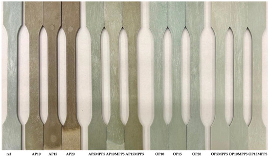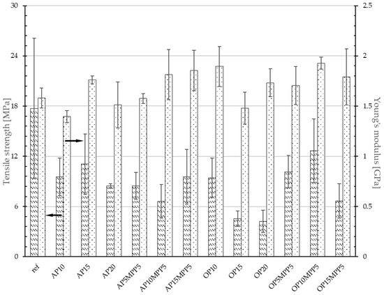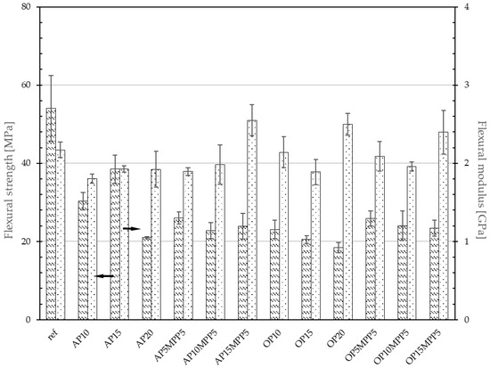 Figure 3. The 20 phr OP specimens’ flexural modulus was above the reference. The addition of MPP to the OP resulted in increased flexural modulus, similar to the tensile modulus, with the exception of the OP15 samples. The OP5MPP5 and OP10MPP5 samples’ flexural modulus was around 2 GPa, while for the OP15 sample with 5 phr MPP, the flexural modulus increased to 2.4 GPa.