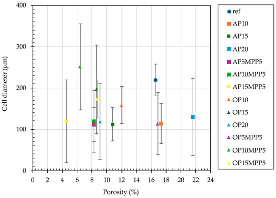 Figure 2). For the most part, the addition of MPP reduced porosity when compared to samples made with a similar flame retardant agent ratio. The reason for that is that MPP has the largest particle size, 24 μm, which affects viscosity. Due to the additive, the mobility of molecular chains decreases, which has a direct effect on cell formation, and since MPP most likely increased viscosity, the gas bubbles could not expand properly; hence, the cells could not coalesce. Tiwary et al. [
