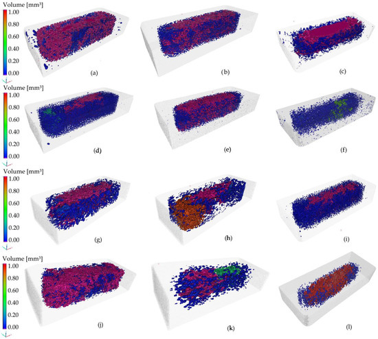Figure 3l) specimen showed moderate porosity of 8.68%, and, despite the fact that it had above average cell diameters compared to other specimens, the CT scan reveals that there are no coalescent cells. The closed-cell structure was not damaged, since the largest cell was still below 1 mm (