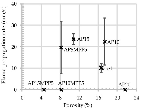 Figure 7. The AP20, AP5MPP5, and AP10MPP5 specimens’ flame spread was determined to be 0 mm/s, because self-extinguishing was observed during the horizontal UL94 test, as opposed to the vertical orientation, where the specimens completely burned.