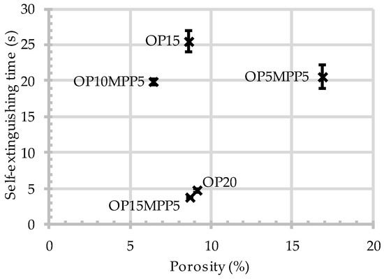 The OP15MPP5 and OP20 mixtures displayed self-extinguishing times below 5 s with five samples; therefore, these combinations are clear to be graded to V0 in accordance with the UL94 standard. We cannot draw any connection between the porosity and self-extinguishing time of the samples, as the porosity of OP15 is similar to the OP20 and the OP15MPP5 samples, while its self-extinguishing time is five times longer. The added MPP is capable of improving the self-extinguishing time of all the mixtures with a similar OP flame retardant agent concentration. It is our belief that this is the result of the combined effects of the charring and the swelling flame retardant agents, hence why the OP15MPP5 hybrid flame retardant sample had the fastest self-extinguishing material.