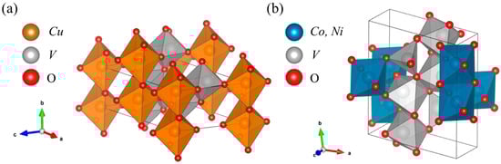 It is not surprising that not all MV2O6 compounds have this ideal brannerite-type structure, as variations in the structure can be expected due to differences in stoichiometry. For example, CuV2O6 is a slight distortion of the brannerite structure with the space group P and consists of CuO6 and VO6 groups (Figure 2a). The Cu–Cu distance along the b-axis is 3.54 Å, and the ∠Cu–O–Cu bond angle is 103.99° within the chains, whereas the Cu–Cu distance along the a-axis is 4.97 Å between the chains [18]. α-CuV2O6 shows quasi-one-dimensional behavior with short-range magnetic ordering and on cooling towards a long-range antiferromagnetic transition at 24 K [19,20]. On the other hand, MV2O6 (M = Co and Ni) have NiV2O6-type structures with the space group () formed by MO6 and corner-shared VO4 and corner- and edge-shared VO6 (Figure 2b). The M–M distance along the b-axis is 2.96 Å, and the ∠M–O–M bond angle is 92.67° within the chains, whereas the M–M distance along the a-axis is 7.13 Å between the chains in the NiV2O6-type structure [21]. Comparing these three brannerite-related structures, we have the ideal brannerite with a monoclinic angle greater than 110°, the distorted brannerite with a triclinic angle around 110°, and the NiV2O6-type with a triclinic angle approximately 93°. The structures of these compounds show octahedral coordination of the M-site ion by oxygen, often with distortion attributable to the varying magnitudes of the Jahn–Teller effect exhibited by each metal ion [22].