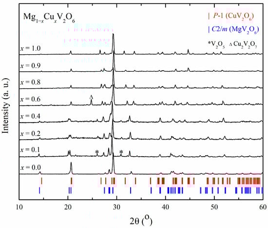 Powder XRD patterns of Mg1−xCuxV2O6 (x = 0.0–1.0) samples prepared at 600 °C in air.