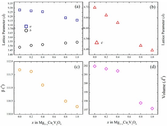 Similarly, Mg1−xCuxV2O6 (x = 0.0–1.0) samples were synthesized at 600 °C in air, and the powder XRD patterns are shown in Figure 3. The Mg1−xCuxV2O6 series shows a change in structure from monoclinic brannerite (C2/m) to brannerite with a slight triclinic distortion () [17]. We can see the sample has a mixed phase starting from x = 0.4 with impurities. Based on the structural analysis (Figure 4a,b), the lattice parameters a, b, and c; angle β; and the unit cell volume are presented for the ranges x = 0.0–0.4 and x = 0.8–1.0. These variations are attributed to a miscibility gap between the C2/m and space groups, leading to a mixture of phases with impurities at x = 0.6. The a and c parameters show a decrease in the lattice through the substitution of Mg2+ by Cu2+, while the b parameters exhibit an increase. Since the ionic radii of Mg2+ and Cu2+ are 0.72 Å and 0.73 Å in the 6-fold coordination, respectively, as the copper content increases, the lattice parameters also exhibit a marginal increase [26]. The a and c parameters, however, show a decrease, and this probably can be explained by the structural distortion leading to lattice contraction. We can observe that the lattice parameter c exhibits a larger decrease compared to the other parameters. The change in the angle β and decrease in volume with the increasing amount of Cu2+ in the brannerite-type structure are observed in Figure 4c,d. Therefore, we can conclude that the shrinking of the brannerite structure, accompanied by distortion upon Cu2+ substitution, is influenced by the strong Jahn–Teller effect of Cu2+.