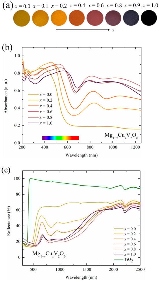 (a) Photographs, (b) DRUV–Vis absorbance, and (c) NIR reflectance spectra of Mg1−xCuxV2O6 compounds. The NIR reflectance of TiO2 is also shown for comparison in (c).
