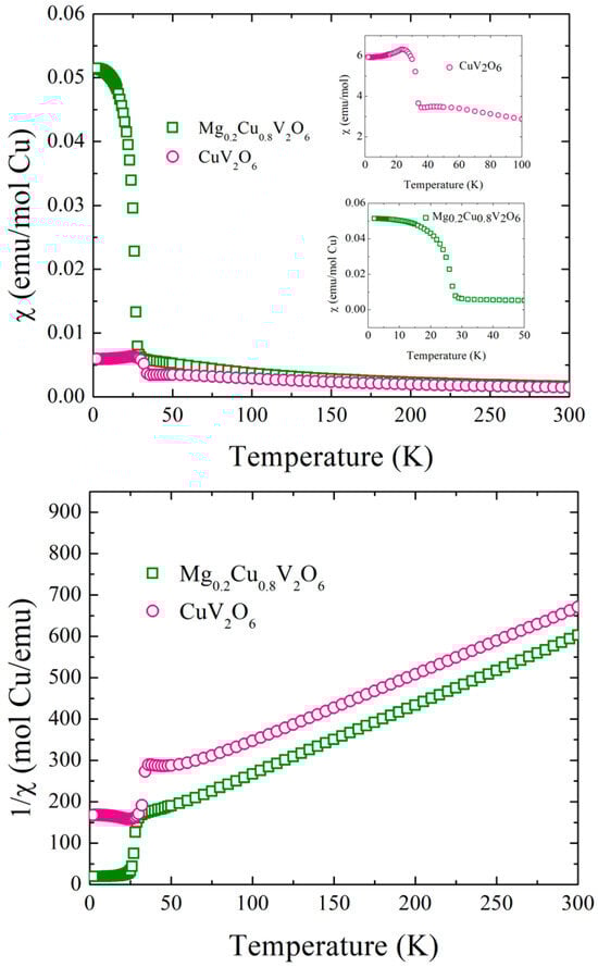 For Mg1−xCuxV2O6 (x = 0.8 and 1.0) in Figure 6, as the Cu concentration decreases, we observed a decrease in the magnetic ordering temperature. Additionally, at x = 1.0, antiferromagnetic ordering with TN = 22 K is observed, consistent with previous studies [27]. In the inset in Figure 6, the molar susceptibility of CuV2O6 is displayed, and we observed that the magnitude of the ferromagnetic signal was around 3 emu/mol, which is very small compared to a FM saturation moment. This signal, which accounts for less than 0.1% of the compound, suggests the presence of uncompensated spins. We can conclude that the magnetic coupling is relatively weak in the structures. Mg0.2Cu0.8V2O6 exhibits magnetic interactions along the b-axis, with an edge-sharing octahedra contributing to ferromagnetic ordering. Based on the Curie–Weiss law in the temperature range between 250 and 300 K, a negative Curie temperature (Θ) suggests that the Cu2+ magnetic moments might overall exhibit antiferromagnetic correlations. The calculated effective moments for the samples with x = 0.8 and 1.0 are 2.16 and 2.14 μB, respectively (Table 2). The results show a slightly larger magnetic moment than the theoretical value (μeff = 1.73 μB); however, the values fall within the observed range and are consistent with the literature [27]. The enhanced effective magnetic moment is attributed to the partial orbital contribution resulting from Jahn–Teller distortion. This is further supported by the discussion of lattice parameters in the Structural Analysis (Section 3.1), with the structure of CuV2O6 shown in Figure 2a. The measurements confirm that the oxidation state of copper is indeed +2 in Mg1−xCuxV2O6 (x = 0.8 and 1.0) within the structure.