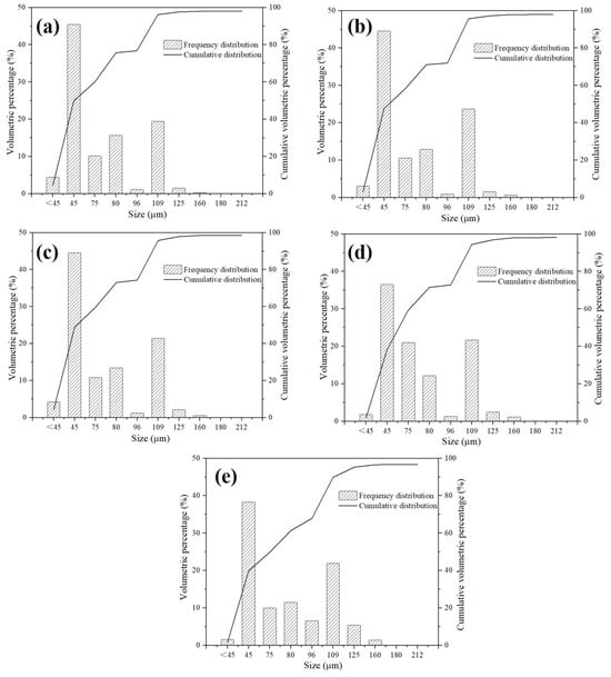 Figure 1. Frequency distribution (left Y-axis) and cumulative distribution (right Y-axis) of particle size of different compositions of granulated powder: (a) composition A; (b) composition B; (c) composition C; (d) composition D; and (e) composition E.
