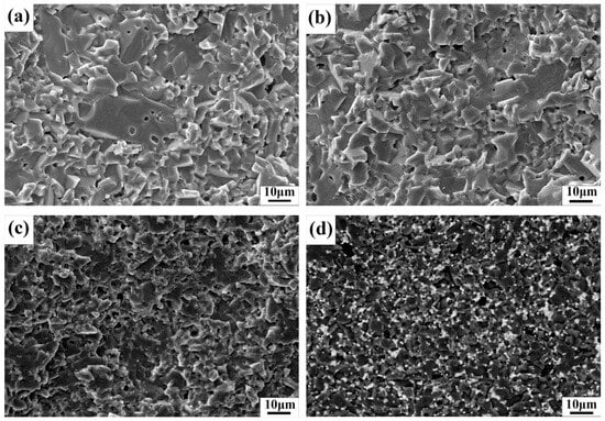 The sintering temperature represents a pivotal parameter in the preparation of alumina ceramics, with the selected temperature directly influencing the degree of densification and the microstructure of the ceramics [16]. Fan et al. prepared six sets of ZTA ceramic samples at temperatures ranging from 1100 to 1450 °C [17]. The findings indicated that the densification and mechanical properties of the samples increased with rising temperature, with the highest fracture toughness attained at 1450 °C. Nevertheless, excessively high sintering temperatures can result in unfavorable outcomes such as closed pores within the grains and abnormal grain growth, which reduces the densities and mechanical properties of ceramics [18].