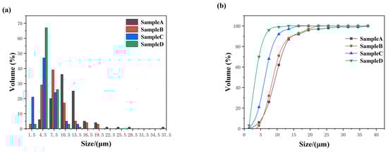 Figure 3. Grain size distribution of alumina in samples A–D: (a) Frequency distribution and (b) Cumulative distribution.