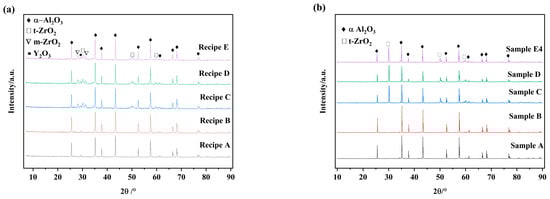 Figure 4. XRD patterns of granulated powder and post-fired samples. (a) Granulated powders; (b) The sintered samples.