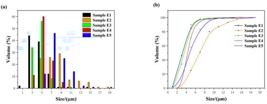 Figure 6. Grain size distribution of alumina in samples E1–E5: (a) frequency distribution and (b) cumulative distribution.