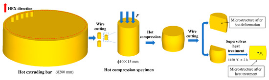 After the isothermal hot compression test, the samples were divided into two parts along the axial direction by electrical discharge machining (EDM), and some of them were then heat treated. The heat treatment regime was 1150 °C for 2 h and then air-cooling to room temperature. According to our previous studies [30], 1150 °C is the over-solution temperature of the alloy and the prime γ′ phases will dissolve quickly during supersolvus heat treatment. Figure 2 shows the sampling locations of the hot compression specimens and the subsequent experimental procedures.