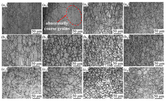 The microstructure at P1 after holding the alloy at 1150 °C for 2 h following separate hot deformation at 1020 °C. The reduction amounts of (ai–ci) (i = 1, 2, 3) are 10%, 30%, and 60%, respectively; the reduction rates corresponding to (a1–a4) are 0.001 s−1, 0.01 s−1, 0.1 s−1, and 1 s−1, respectively; and the meanings of (b1–b4,c1–c4) are the same as those of (a1–a4).
