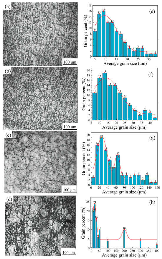 The microstructure photos and corresponding grain size distributions of the alloy after hot deformation and over-solution treatment. Hot deformation conditions: (a) 1020 °C, reduction 30%, reduction rate 0.005 s−1; (b) 1070 °C, reduction 10%, reduction rate 0.1 s−1; (c) 1090 °C, reduction 30%, reduction rate 0.005 s−1; (d) 1070 °C, reduction 30%, reduction rate 0.3 s−1. The grain size distributions of (a–d) correspond to (e–h).