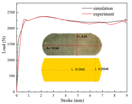 The displacement–load curve and final dimensions of the specimen obtained by simulation and test under thermal deformation conditions of 1020 °C, a reduction rate of 0.1 s−1, and a reduction 60%.