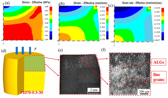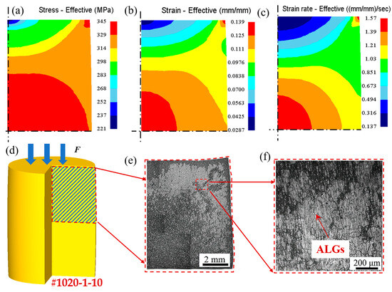 The distribution nephograms of strain, strain rate, and stress after a deformation temperature of 1020 °C, reduction rate of 1 s−1 and reduction of 10%, and microstructure photographs after over-solution treatment. (a–c) Nephograms of equivalent stress, equivalent strain, and equivalent strain rate distribution in the shaded area in (d) after thermal deformation, respectively; (e) is the microstructure of the shaded area in (d) after solution treatment; and (f) is the enlarged area of abnormally large grain microstructure in (e).