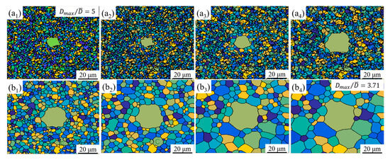 The CA simulation results of grain growth accompanied by the dissolution of the γ′ phase in supersolvus heat treatment. (a1–a4) The CA simulation results of the grain growth accompanied by the local dissolution of the γ′ phase. (b1–b4) The CA simulation results of the grain growth accompanied by the complete dissolution of the γ′ phase.