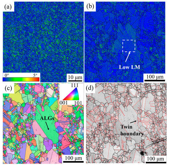 Figure 11 shows the distribution of local misorientation (LM) and twin boundaries before and after over-solution treatment in the area where ALGs appear under thermal deformation conditions #1020-0.5-30. The value of the microstructure shown in Figure 11b after solid solution treatment is 8.2. Figure 11a is the LM figure of the ALGs before over-solution treatment, from which it can be seen that the LM difference distribution inside the specimen after thermal deformation is uneven, which indicates that the stored energy distribution in the specimen after thermal deformation is uneven. Figure 11b is the LM figure of the specimen after over-solution treatment. The ALGs formed after over-solution treatment exhibit a low level of internal orientation difference, and the formation of ALGs partially releases the unevenly distributed stored energy in the specimen after heat deformation. Figure 11c is the IPF of the ALGs, from which it can be found that the formation of ALGs is not accompanied by preferential orientation, which indicates that ALGs are not caused by texture. In addition, during the growth of ALGs, there are high-density twins, as shown in Figure 11d, which may be due to the fact that the twin boundary is a special low-storage energy grain boundary. When low-energy grains absorb high-energy grains to form ALGs, the migration of large-angle grain boundaries releases storage energy, leading to the formation of twin boundaries [37].