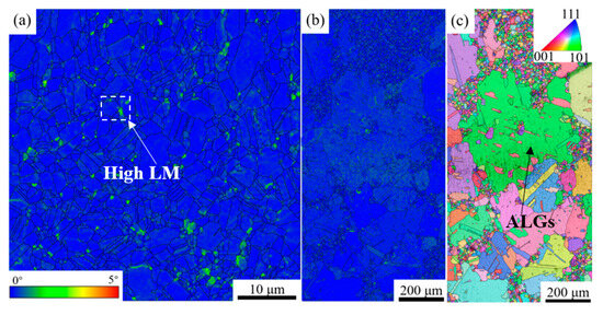 Figure 12 shows the LM and IPF maps of the ALG occurrence area before and after over-solution treatment under the thermal deformation conditions #1020-1-10. The value of the microstructure shown in Figure 12b after solid solution treatment is 7.9. It can be seen that after thermal deformation, there is also a high orientation difference in the ALGs’ area locally, but, compared with the high LM distribution under the thermal conditions #1020-0.5-30, the distribution of LM under this condition is more dispersed. However, over-solution treatment significantly reduces the low local orientation difference (Figure 12b), indicating that over-solution treatment consumes most of the stored energy in the formation of ALGs. Under these conditions, the formation of ALGs should be more appropriately regarded as a limited recrystallization process, and the recrystallized nuclei are likely to originate from the high stored-energy location before over-solution treatment.