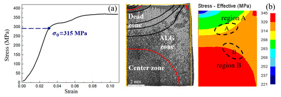 Figure 13 shows the microstructure, von Mises equivalent stress distribution nephograms, and experimentally obtained stress–strain curve of the sample under the conditions of #1020-1-10. The figure shows the yield stress = 315 MPa under the thermal deformation condition. The figure can be divided into three areas based on the amount of deformation and the distribution of microstructures in the sample section: the deformation dead zone, the ALGs region, and the central region. The smallest equivalent stress occurs in the deformation dead zone, where the driving force is insufficient for recrystallization nucleation. However, the stress in the local area of the ALGs is higher than , and nucleation-limited recrystallization may occur. As the position moves towards the central region, the equivalent stress gradually increases, presenting a gradient distribution. Additionally, the driving force of recrystallization increases, leading to complete recrystallization.