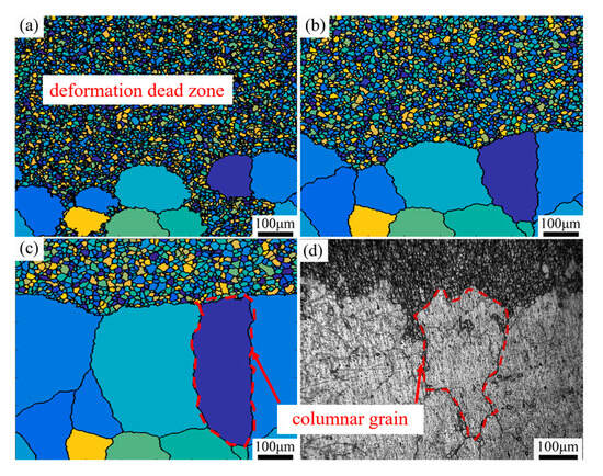 The cellular automata (CA) simulation results of the formation process of ALGs are shown in Figure 14 and Figure 15, which correspond to the boundary regions between the deformation dead zone and the ALGs region (region A) and the central region and the ALGs region (region B) in Figure 13, respectively. It can be seen from Figure 14 that due to the low storage energy in the ALGs region, fewer recrystallized grains are produced, and these recrystallized grains with low energy storage devour the surrounding high-energy deformed grains and grow rapidly until they collide with each other and stop growing. The simulated ALGs are composed of 200–300 μm grains. At the same time, these large grains will also swallow the grains in the deformation dead zone, making the ALGs present in a columnar shape. The experimental microstructure diagram in Figure 14d reveals a continuous elongation of the simulated and experimental ALGs, demonstrating consistency between the two.