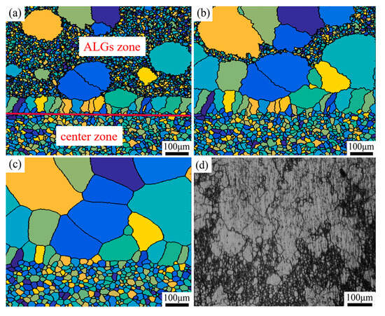 Figure 15 shows the formation process of ALGs in the B region, as obtained by CA simulation. In the figure, the ALGs region is above the red dashed line, and the central region is below. It can be seen that a small amount of recrystallized grains produced in the ALGs region swallowed the surrounding grains, and the formed ALGs were composed of 50–150 μm grains. Because of the high storage energy in the central region, sufficient recrystallization can occur. These recrystallized grains consume the surrounding high storage energy grains and eventually come into contact with the ALGs, as shown in Figure 15a–c. The grain size of the ALGs in this region is smaller relative to the A region, which is due to the higher stress in the B region, which produces relatively more recrystallized grains.